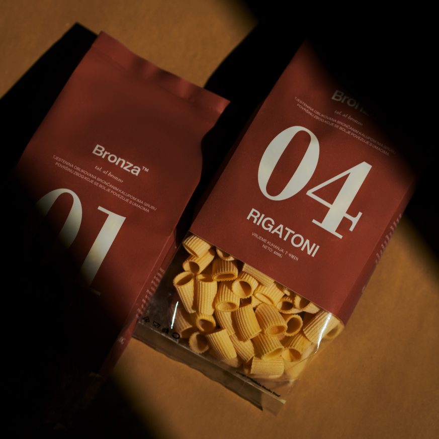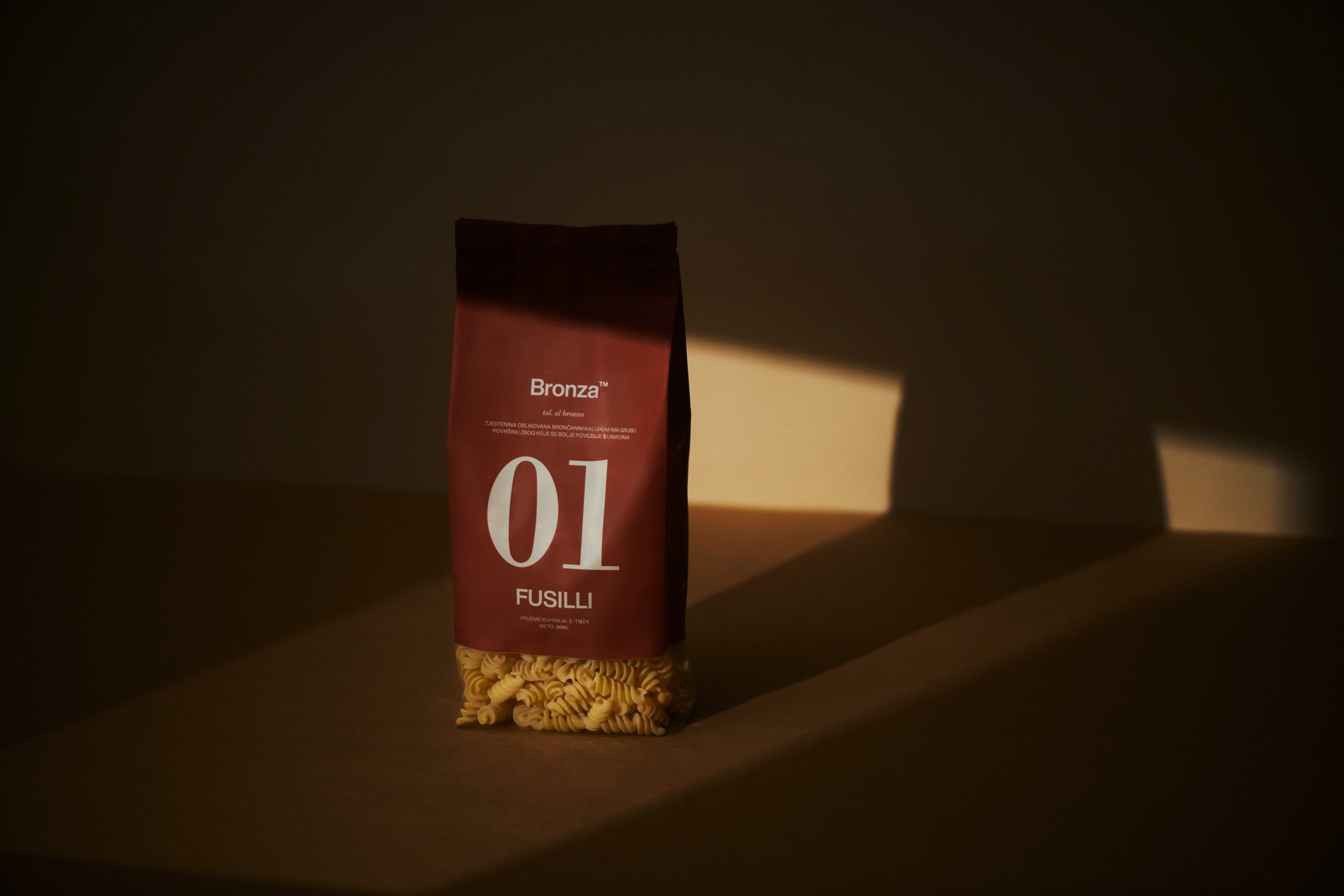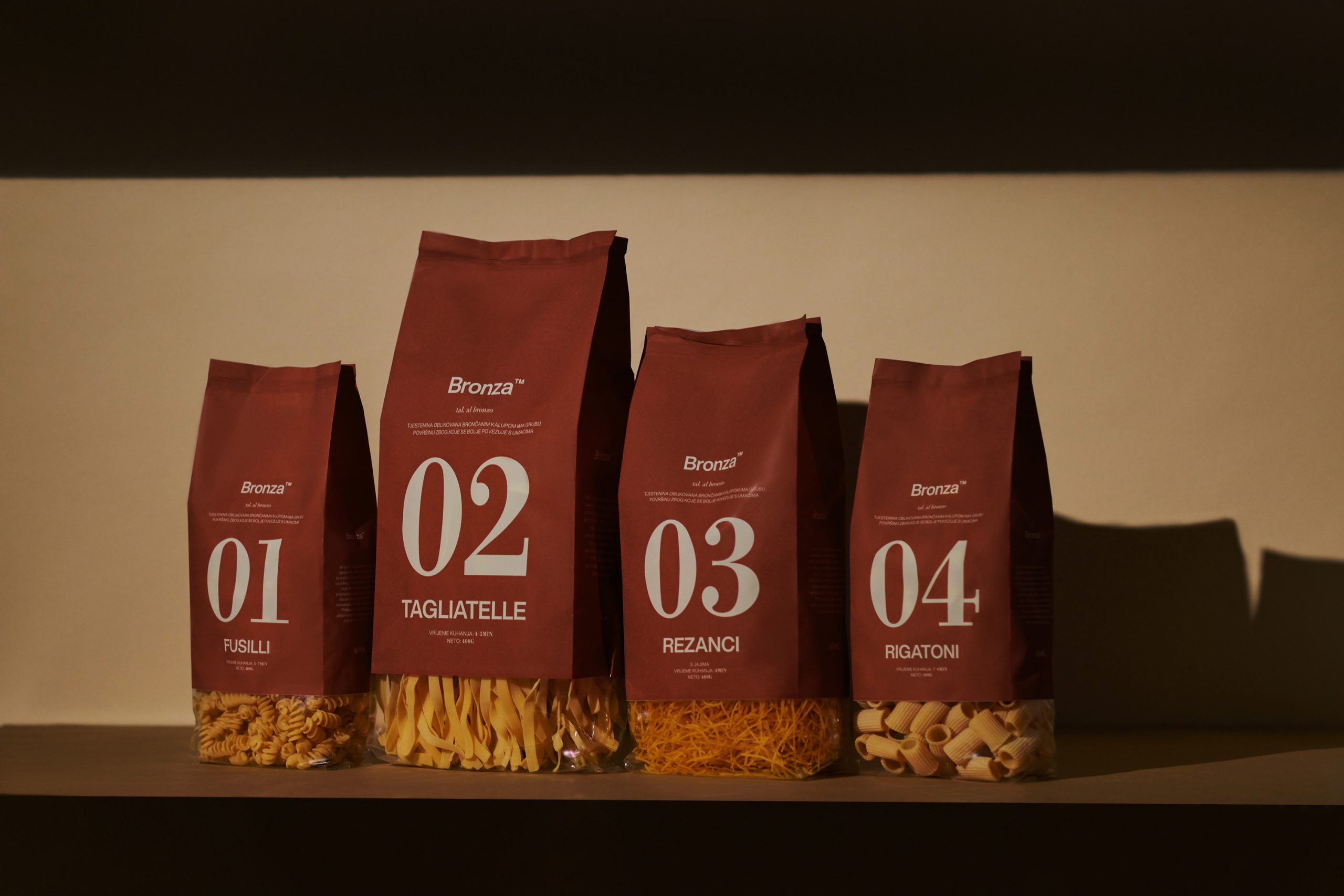 Studio Size created the brand name, visual identity, and packaging design for Bronza—a gourmet pasta brand that uses a unique manufacturing process with bronze dies. This technique imparts a rougher texture to the pasta, improving sauce adhesion and consequently enhancing the dish’s overall taste. The brand’s identity resonates with this unique attribute, as embodied in its name, design, and the subtly textured surface of its packaging.