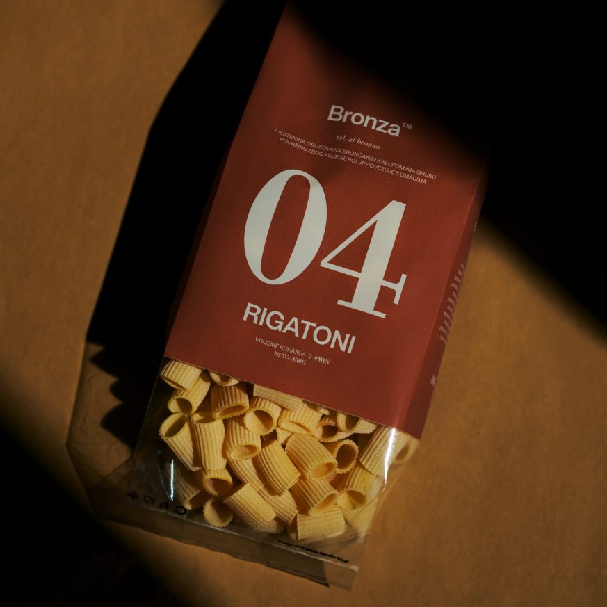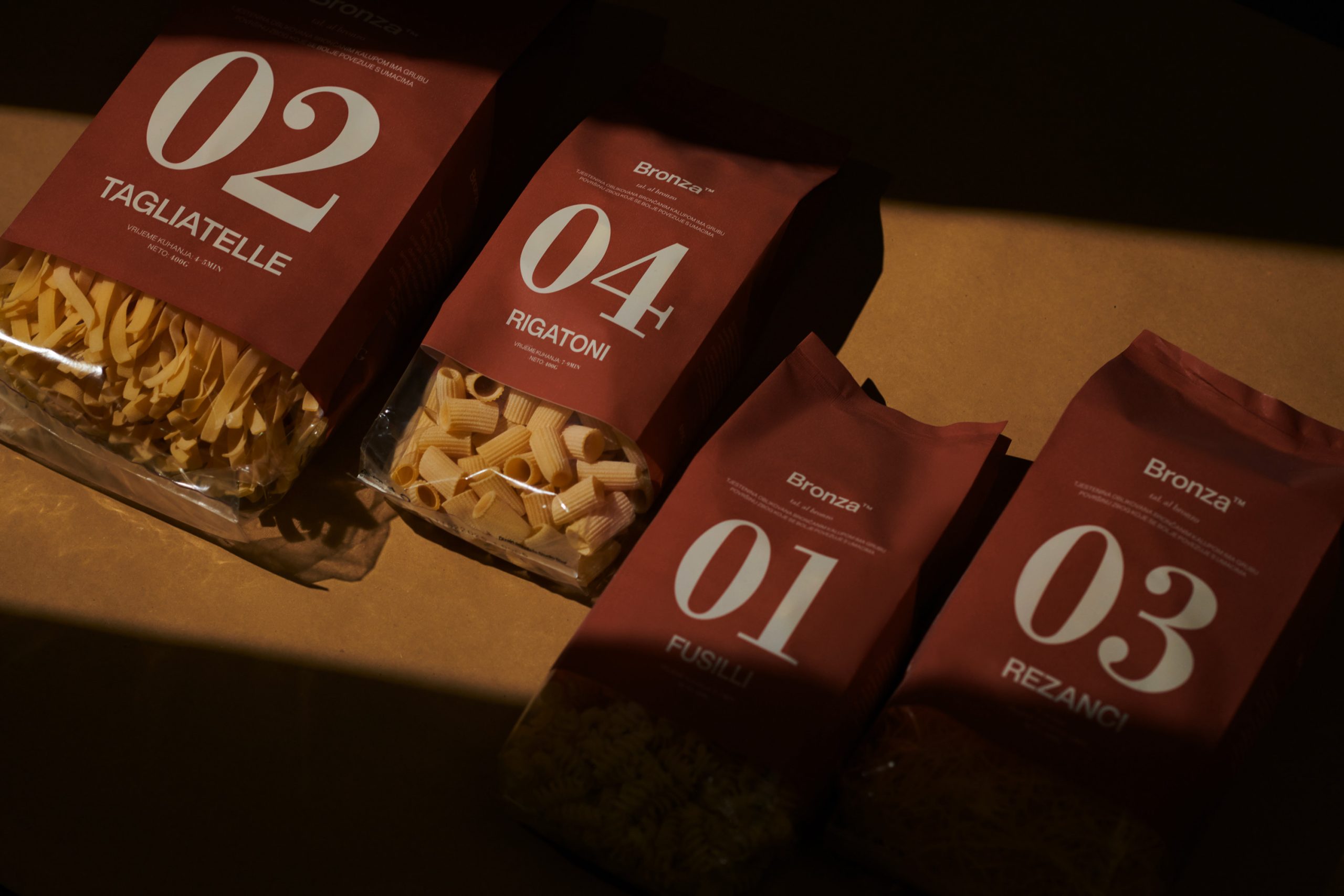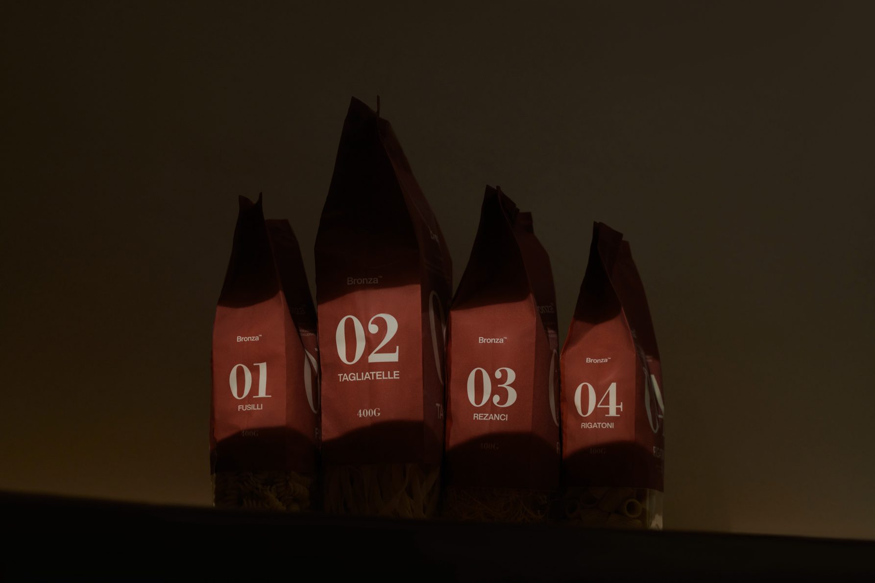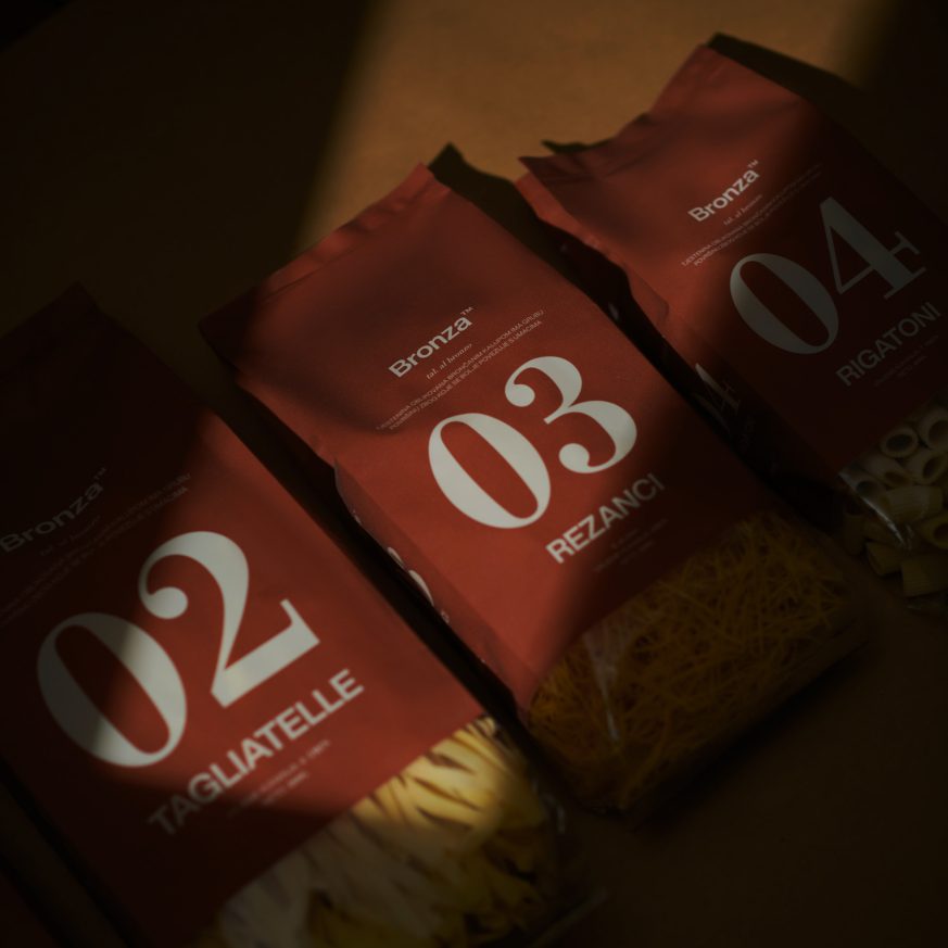 Studio Size created the brand name, visual identity, and packaging design for Bronza—a gourmet pasta brand that uses a unique manufacturing process with bronze dies. This technique imparts a rougher texture to the pasta, improving sauce adhesion and consequently enhancing the dish’s overall taste. The brand’s identity resonates with this unique attribute, as embodied in its name, design, and the subtly textured surface of its packaging.